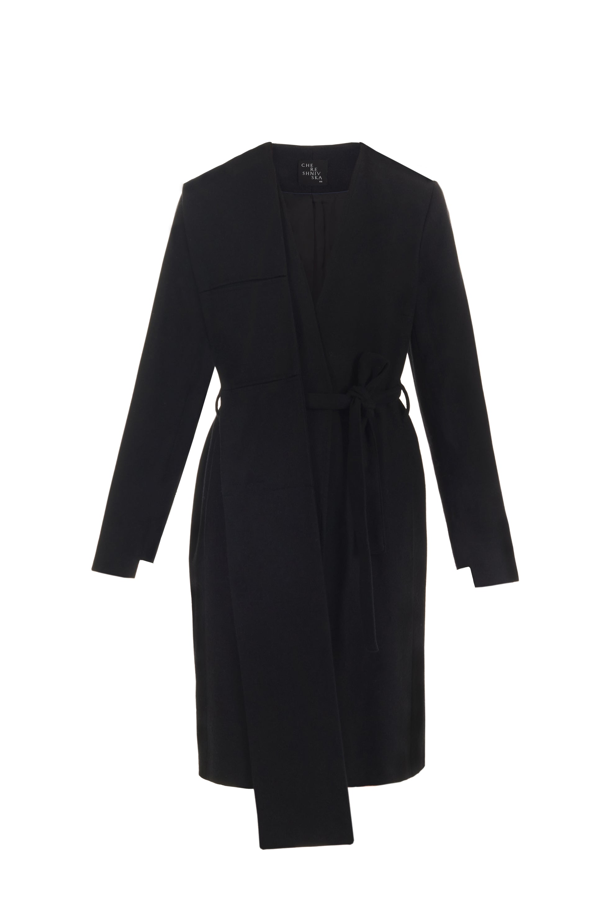This coat is made of 100% wool. Lining 100% viscose, colour dark blue. Straight design. Hidden button fastenings through front. Two side pockets. Removable belt. Detail in front can be removed and used as a scarf.