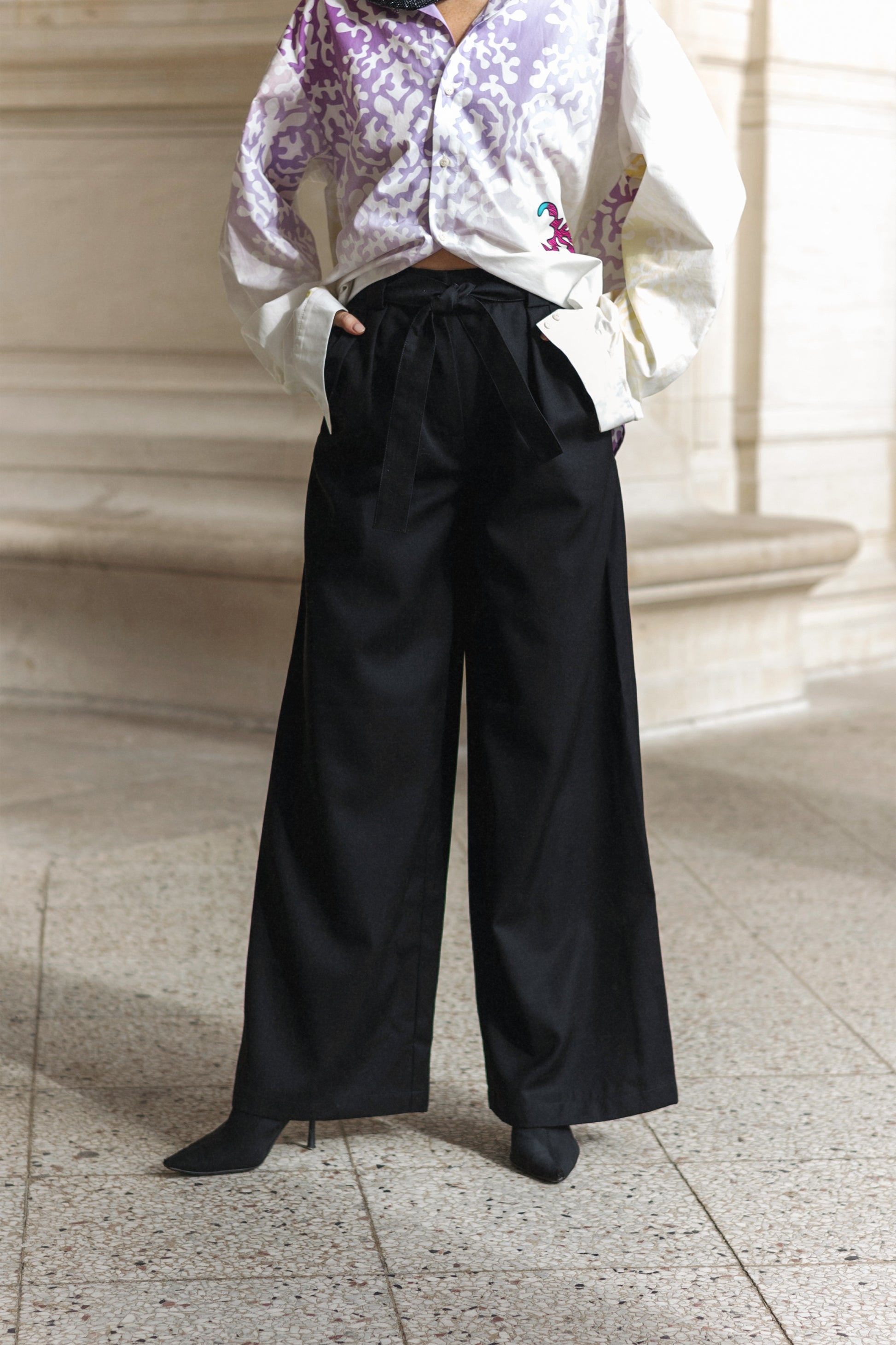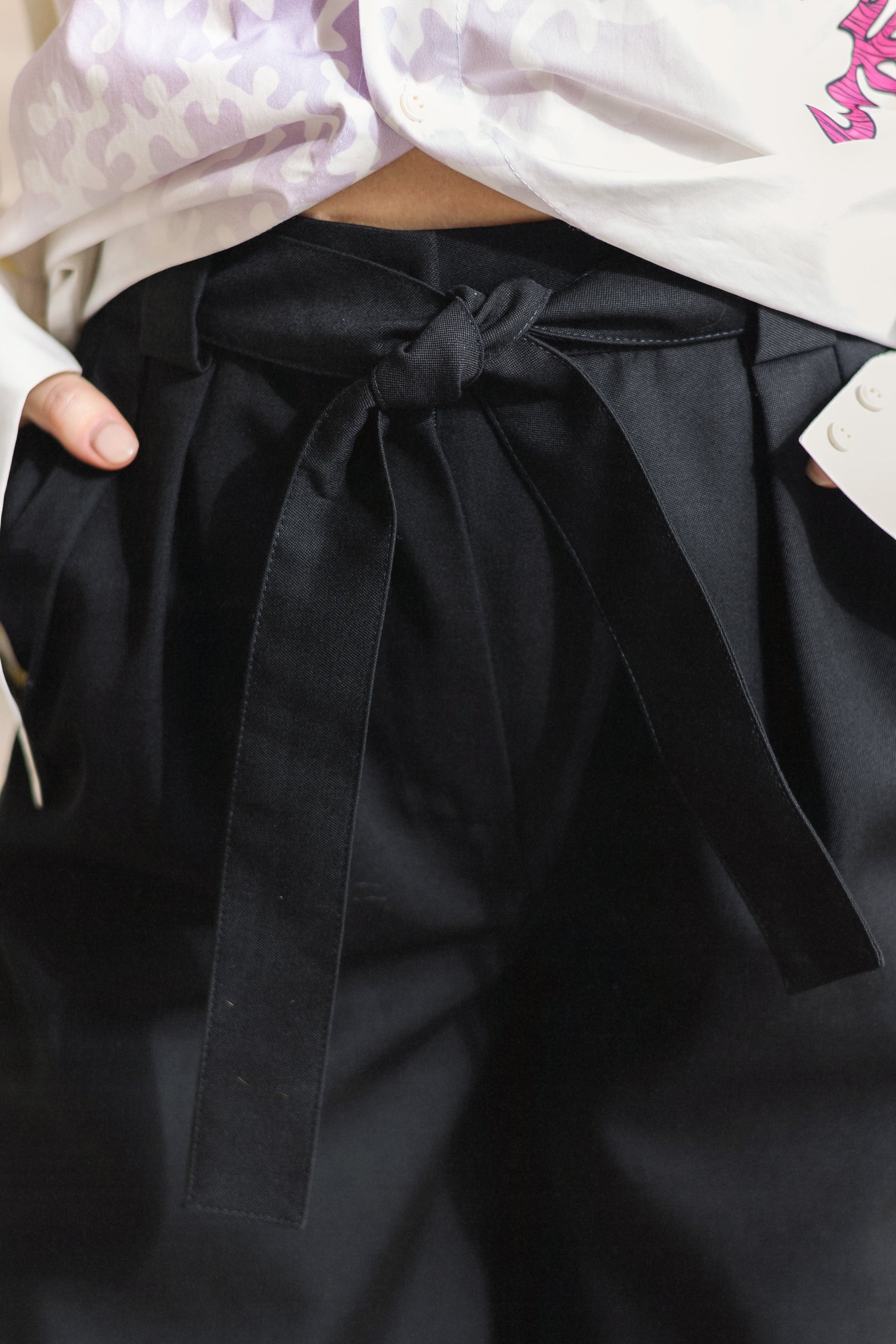 Wide design. Medium waist. The loops. Two side pockets, zip and hook fastening.