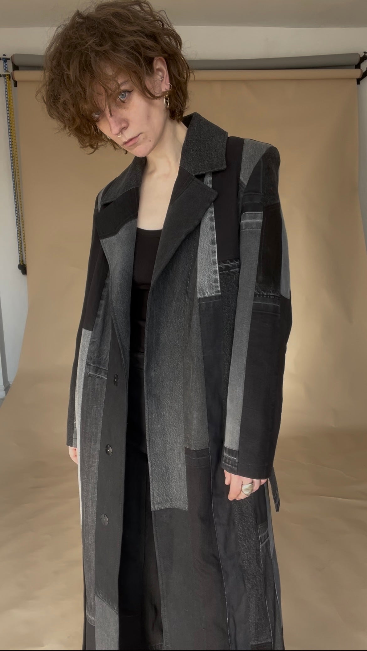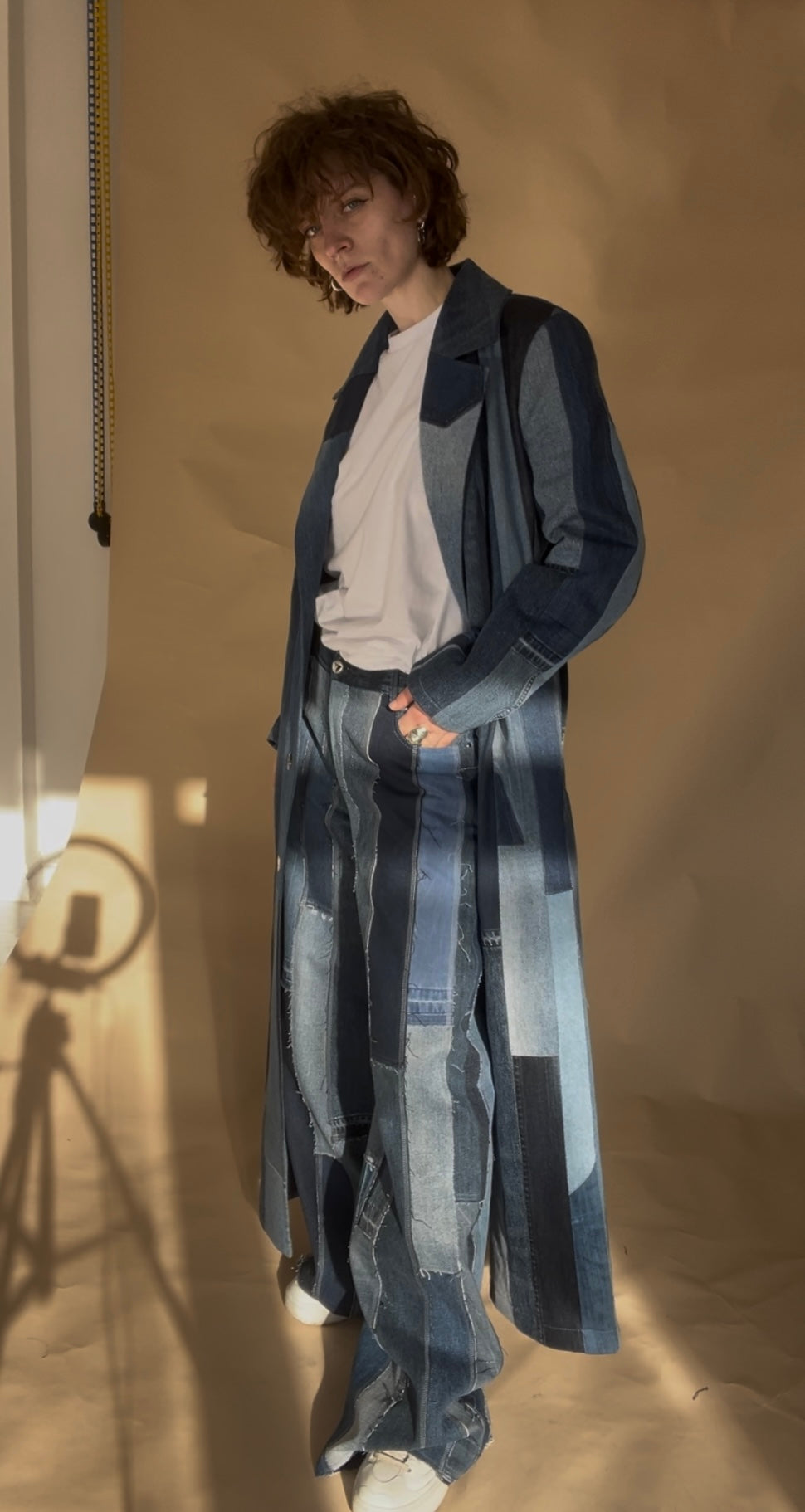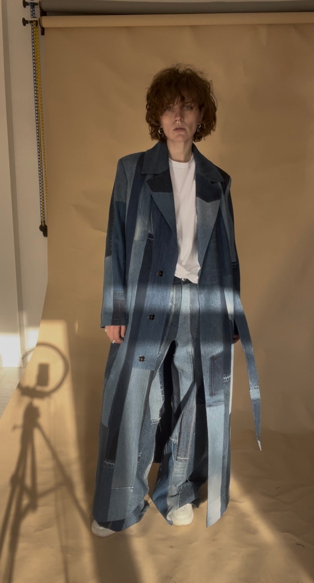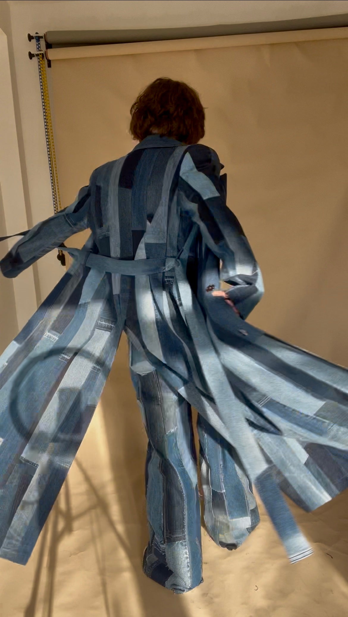 Our Upcycle Trench are not only made in a patchwork technique to minimize production waste, but they are also crafted from second-hand jeans. We carefully select and acquire pre-owned denim, thoroughly wash and revitalize it, and skillfully cut off any damaged or unusable parts. By creatively transforming these reclaimed materials, we give them new life as unique and sustainable trench. Each our Upcycle Trench maintains 100% consistency in style and fit. However, due to the nature of the patchwork process, the combination of patchwork pieces may vary slightly from one pair to another. This individuality adds to the charm and story of each trench, ensuring that your trench are truly one-of-a-kind. Join us in our mission to reduce waste and embrace the beauty of upcycled fashion with our Upcycle Ttench. Each trench carries its own unique narrative, blending sustainability, style, and the art of creative reinvention.