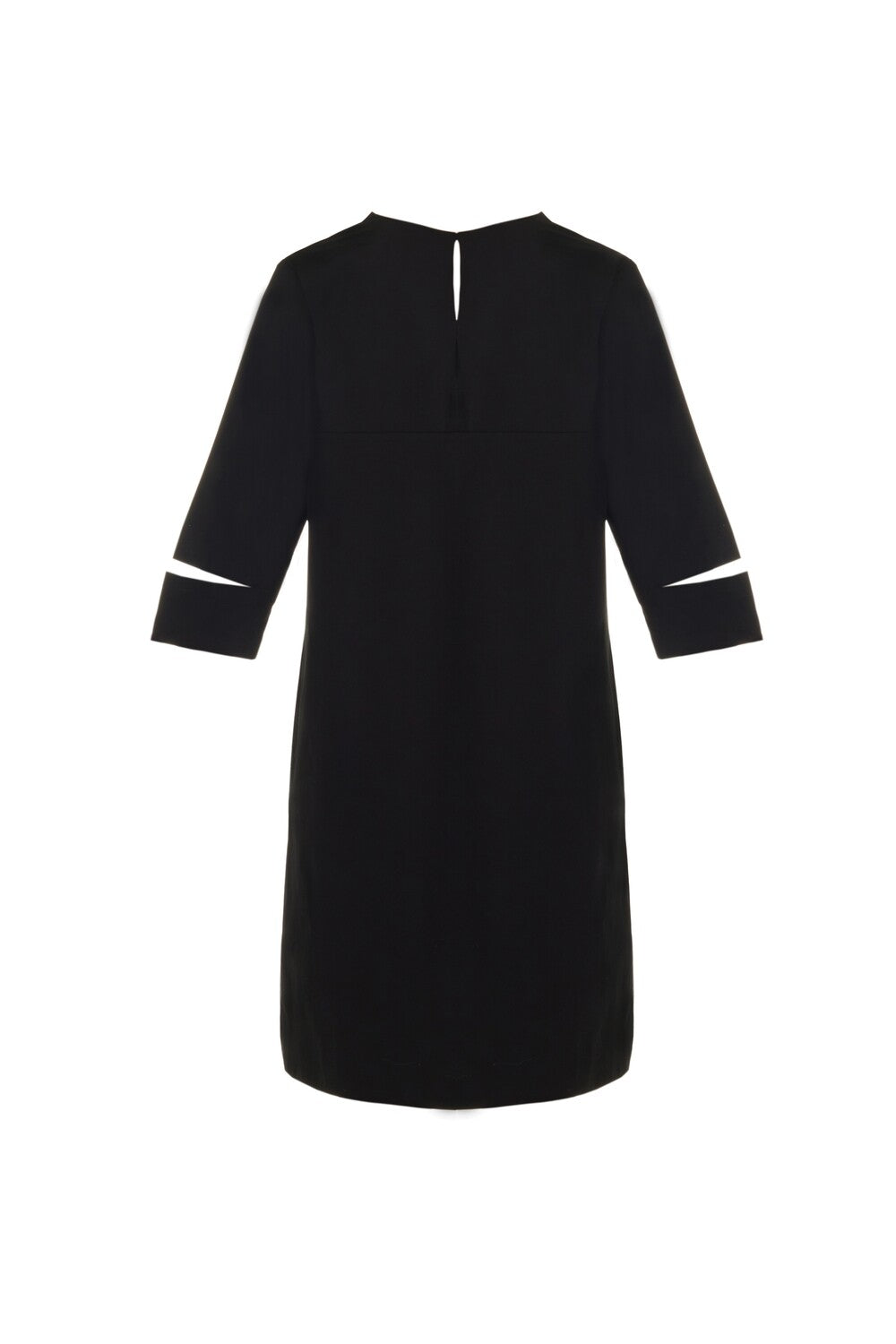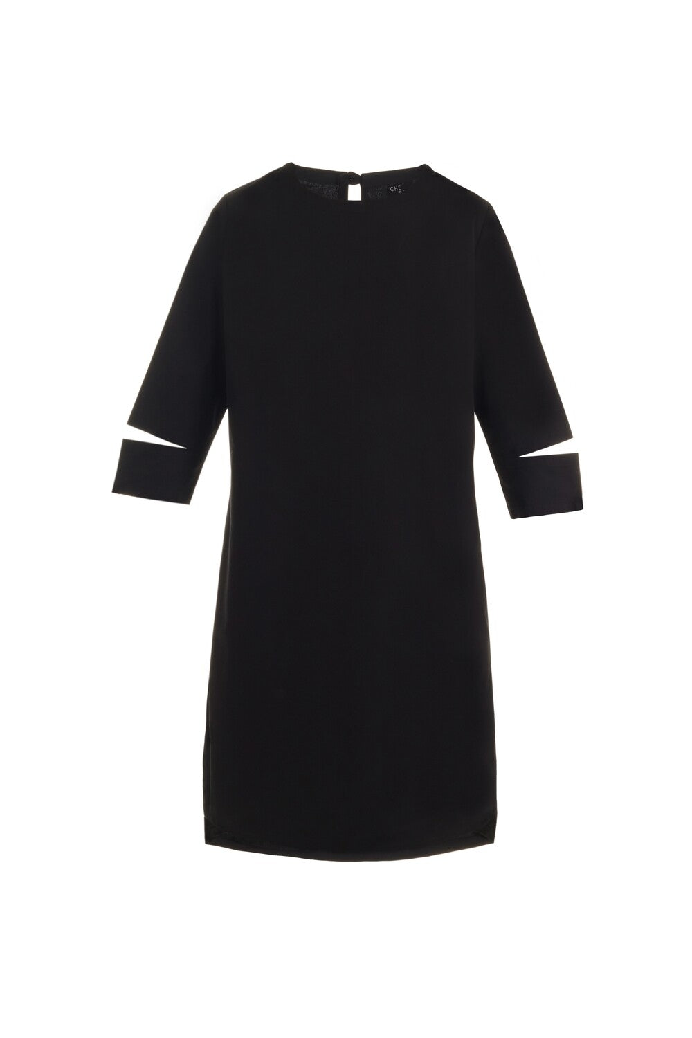 Straight design. Sleeve is 3/4 long. Button down dress fastening in the front. Side seam pockets. Cuts on the elbow line make this simple silhouette design special.