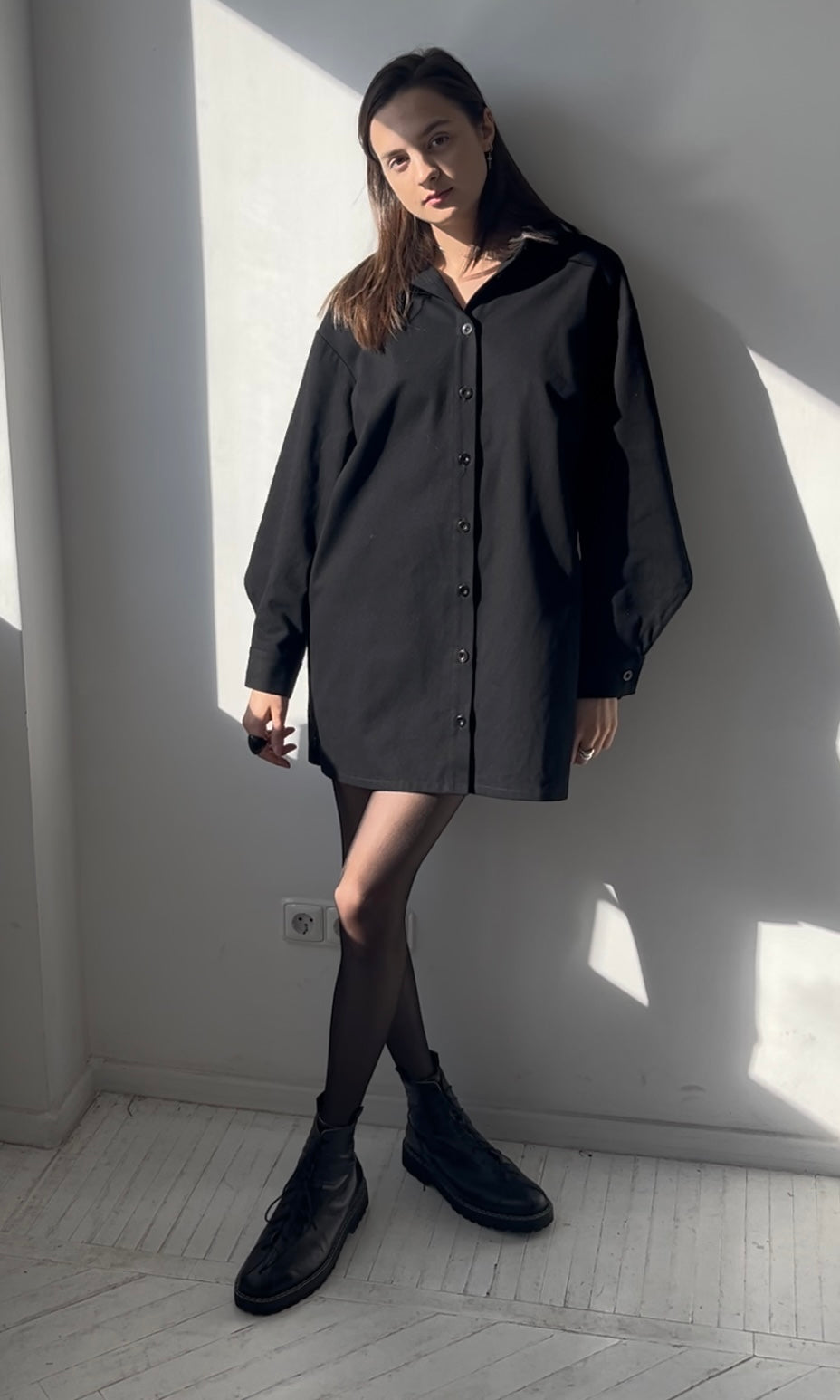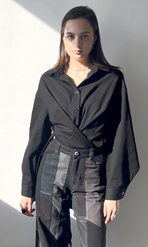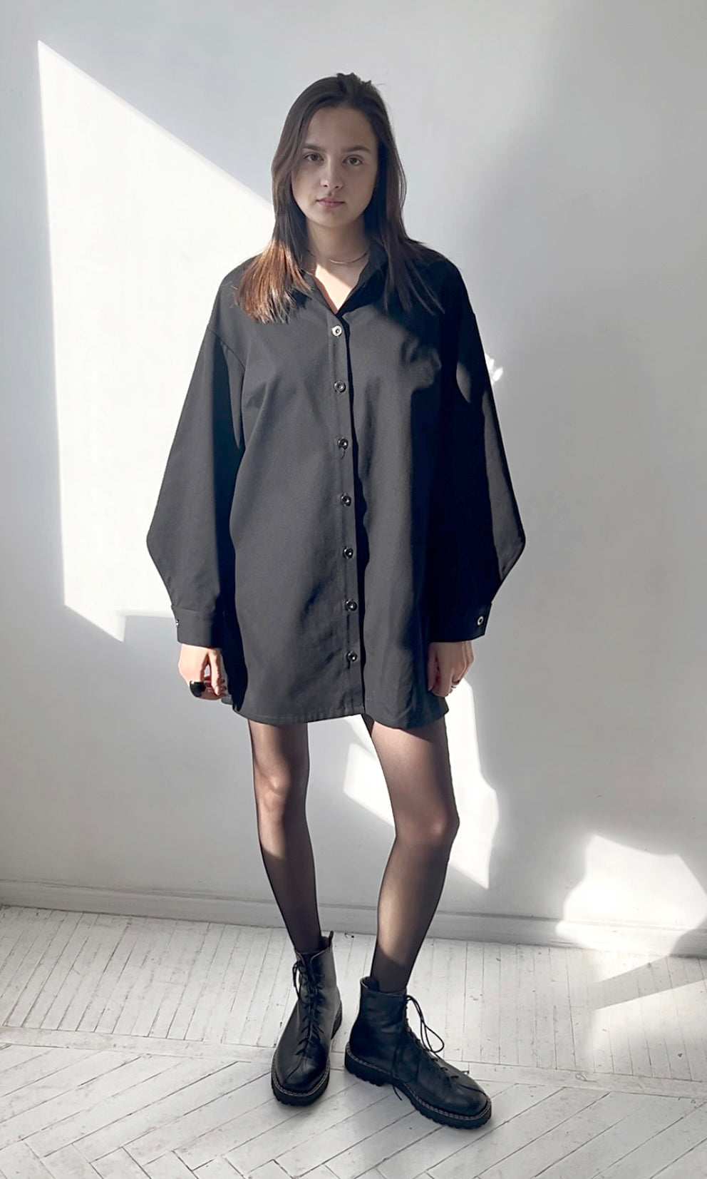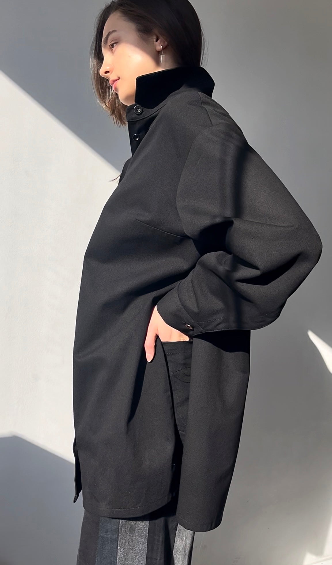Unisex oversized fit. Features black buttons on the front and cuffs, side zippers for easy access to pockets when worn with pants, a removable belt, and voluminous sleeves.