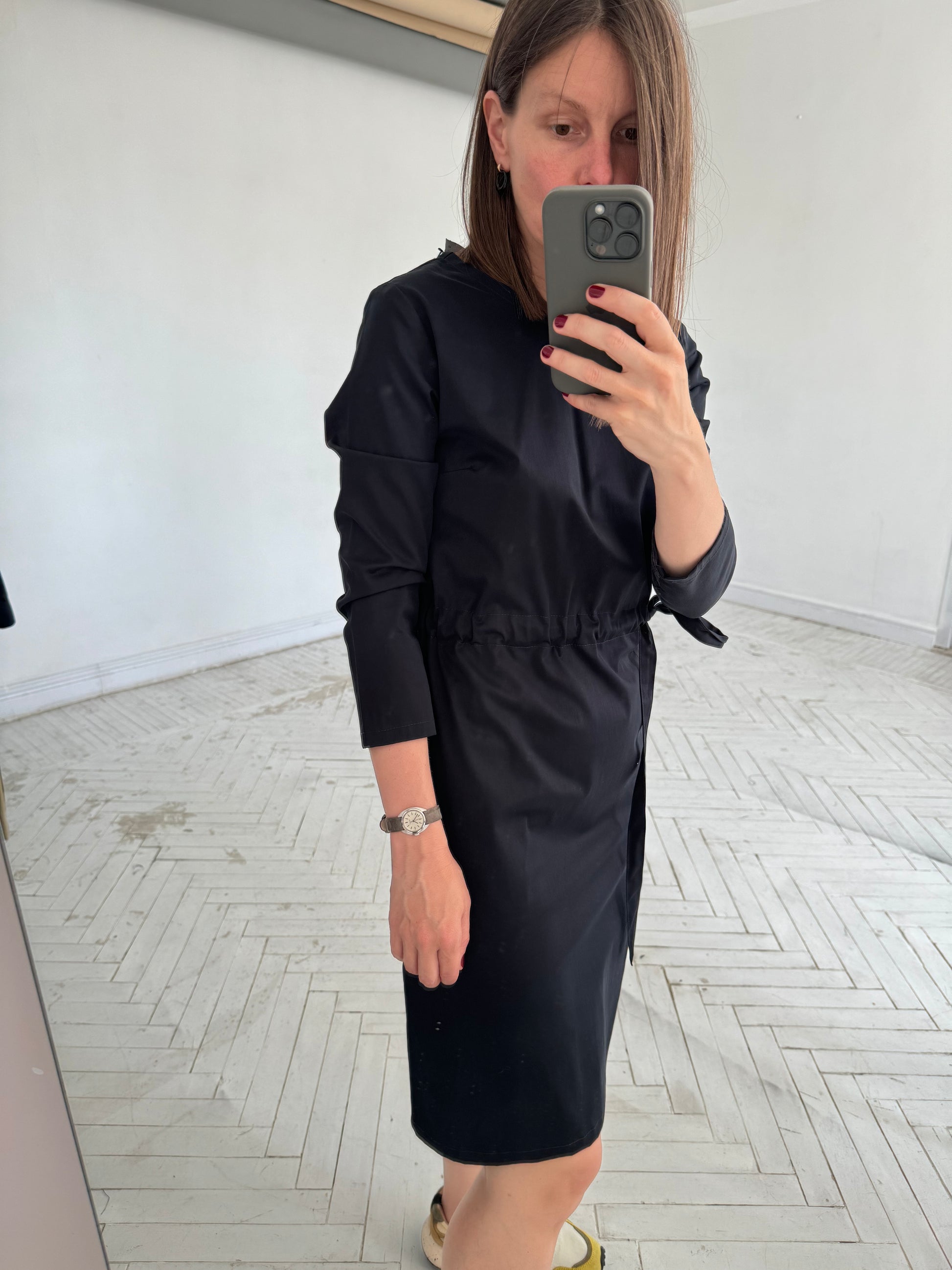 Here your perfect dark violet dress is made from 92% cotton, 8% elastane. This cotton fabric could wrinkle a little during wearing. Straight design. Sleeve 3/4. Button down dress fastening in the back. Side seam pockets.