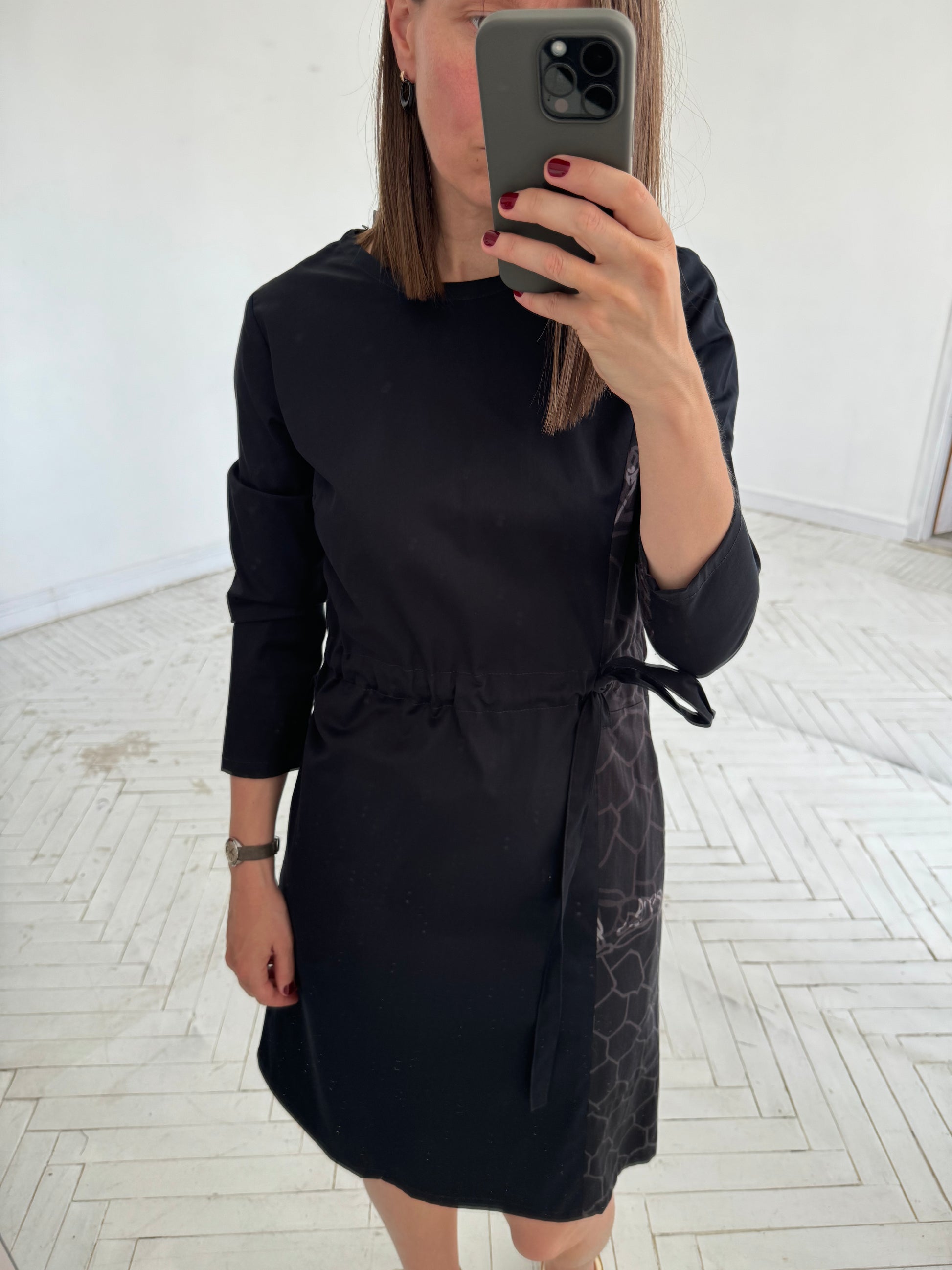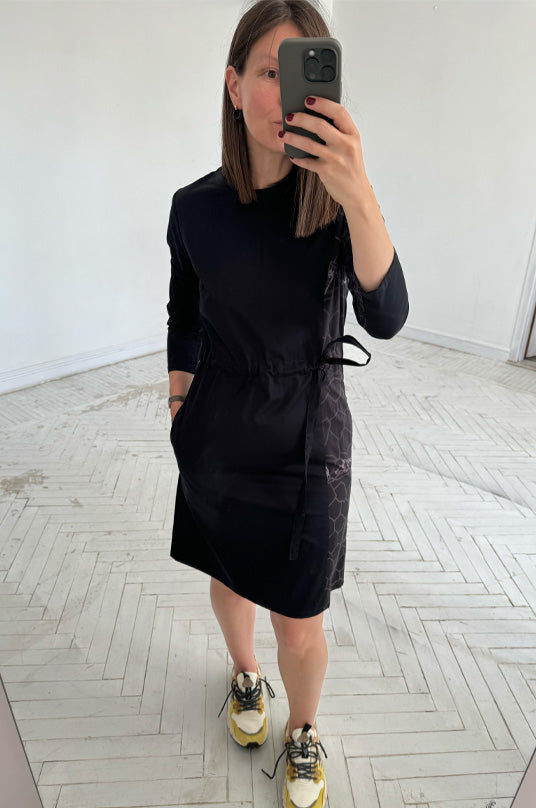 The sewn print and asymmetrical detail in front makes this simple silhouette design special. This fancy dress combines well with bright sneakers and heels shoes as well. It could be a party dress, or wedding guest dress or for everyday.