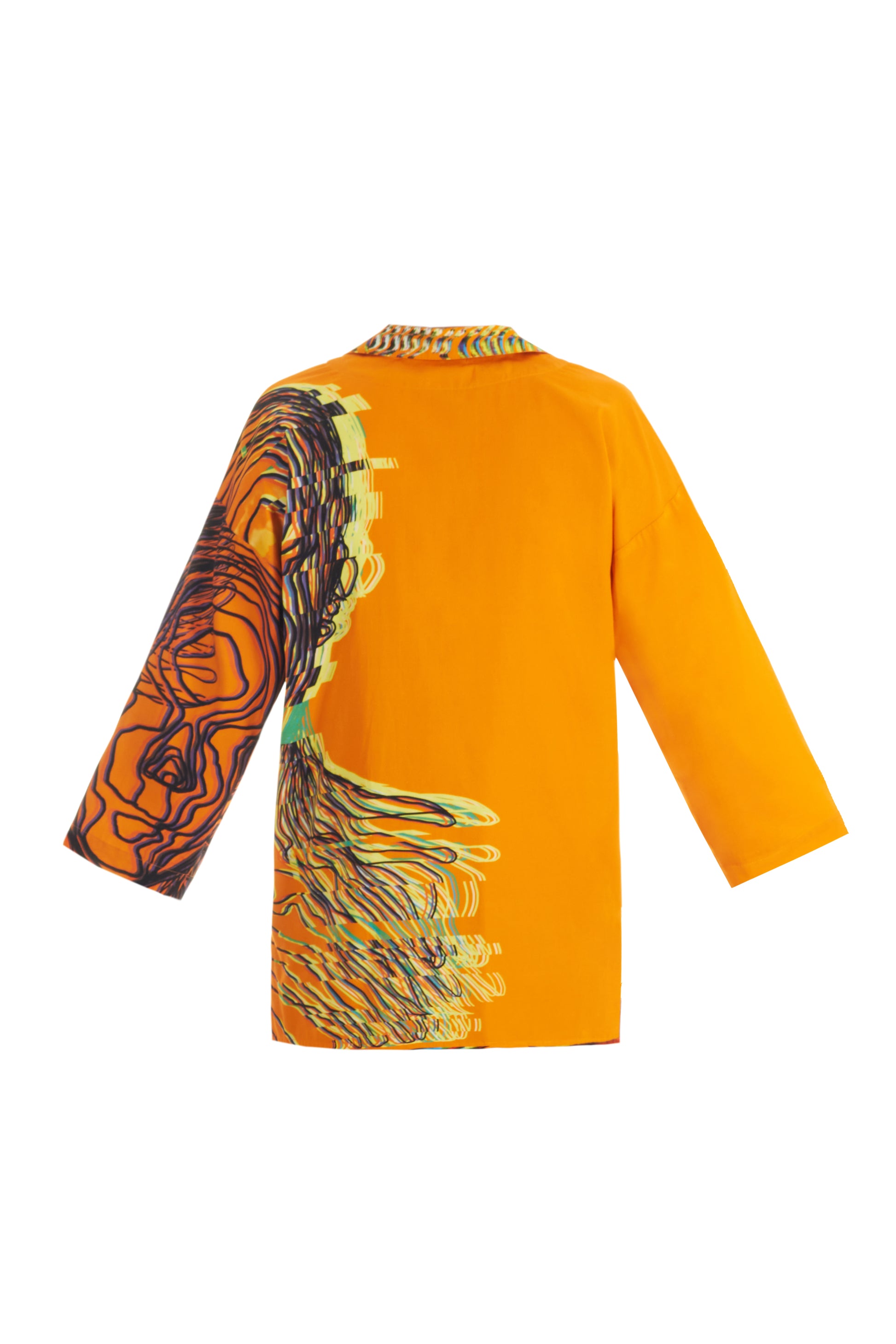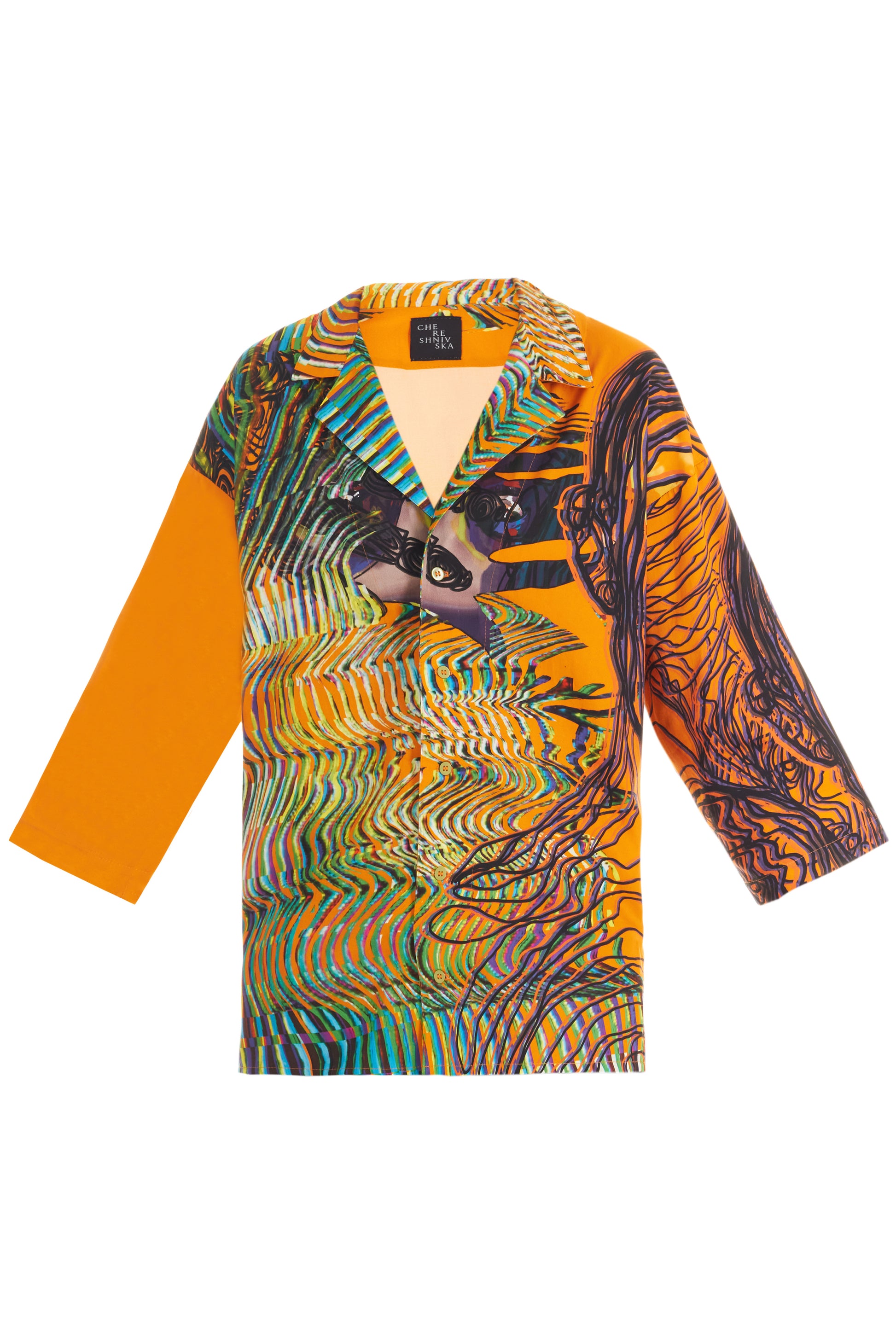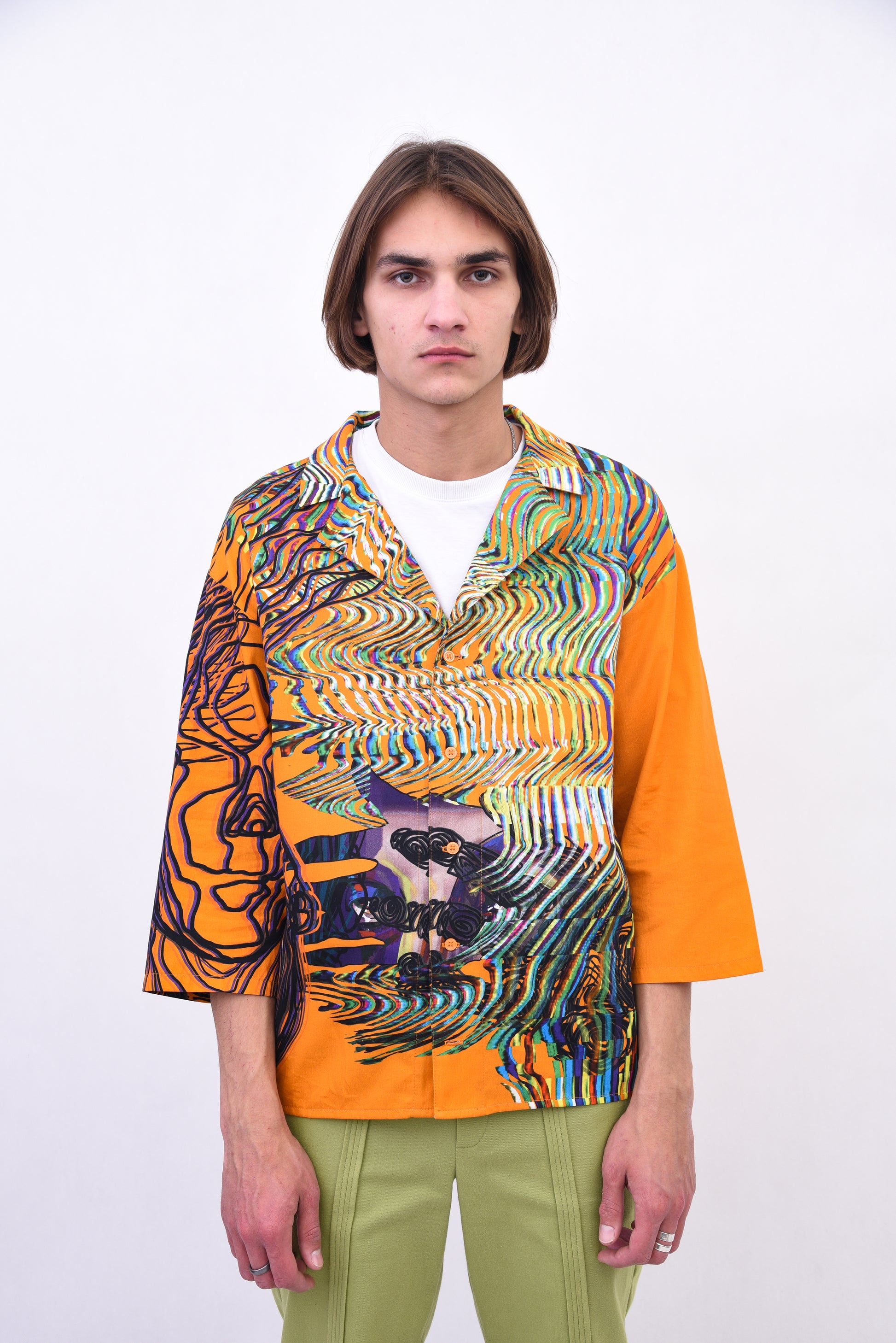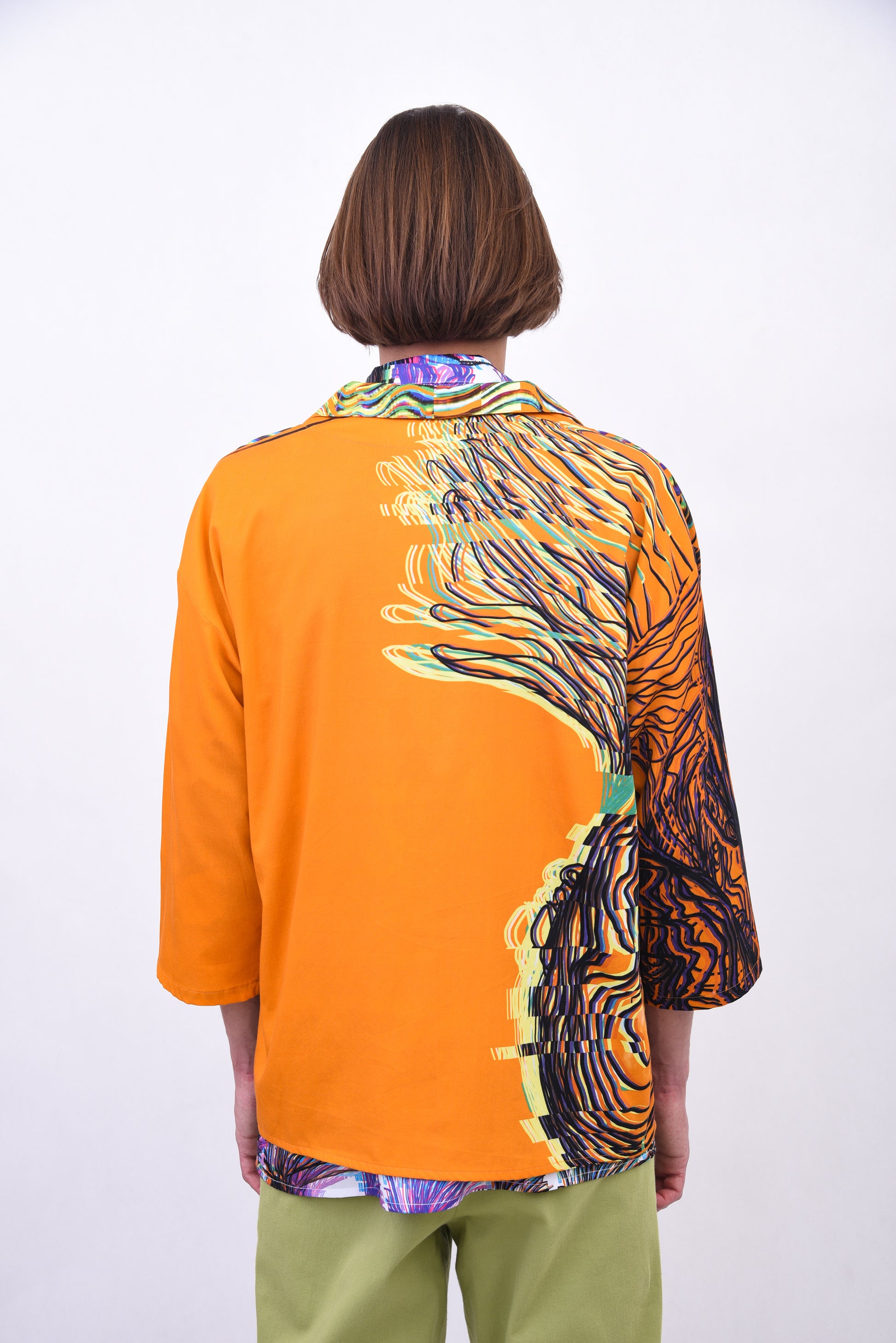 Unisex and oversize style. Lowered shoulder line. Sleeve is 3/4 long. Relaxed camp collar. Button fastening.