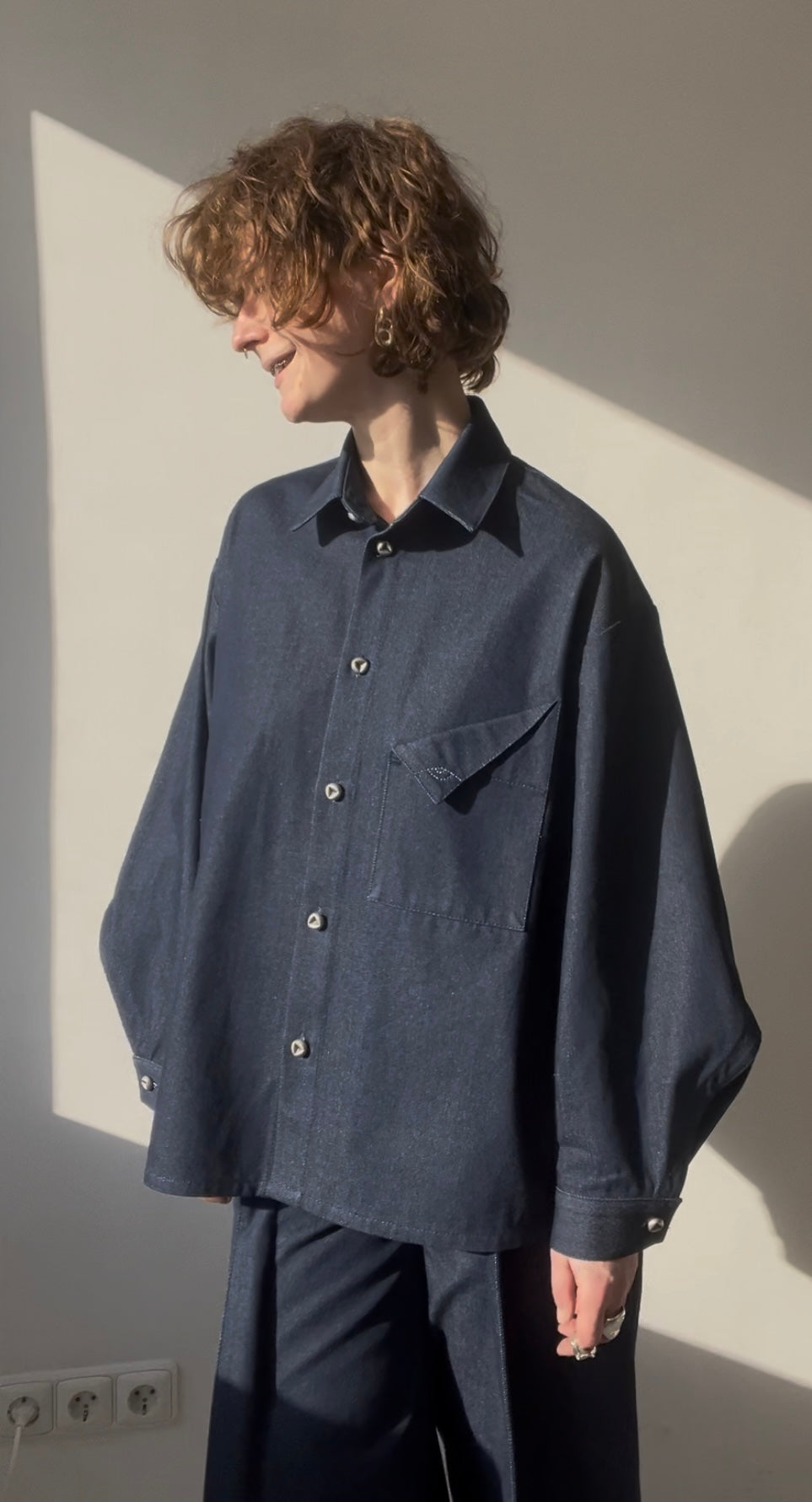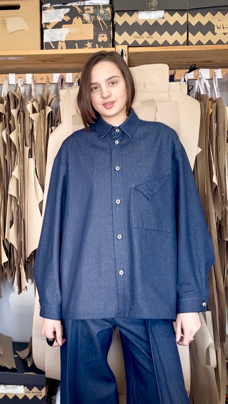 Unisex. Oversized fit. Designed with metal buttons at the front and cuffs, a single front pocket, and voluminous sleeves. Additional colors available upon request: Natural (rinsed) and Blazing Yellow.